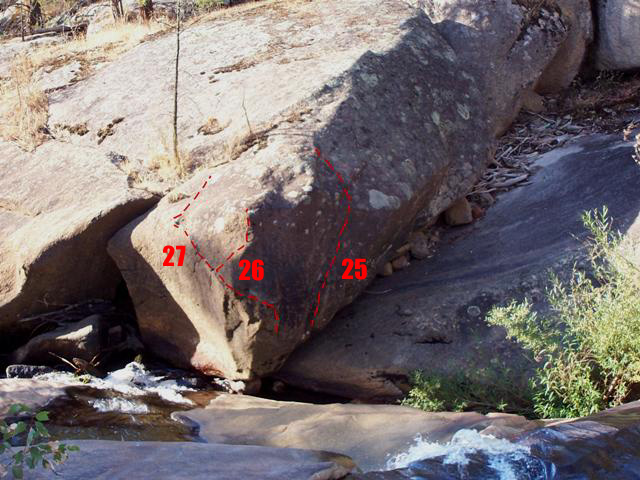 Cross back to river left of the creek and follow it downstream passing many rapids and small waterfalls, passing problem 28 on the way. “Sink or swim” is on the boulder about 100 metres from the end of the waterfalls.