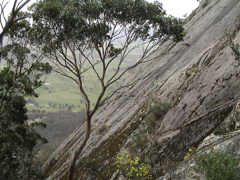 Right: Ben Nevis viewed from the road. Red Rocks is the rightmost cliff. There are climbs at the leftmost cliffs too (North Cliff & Centre Cliff). These are accessed via the summit lookout picnic area. There are several ways to drive in via the forest tracks, some of which may not be suitable for the family sedan if it's very wet, though I haven't been bogged yet in the camry. Driving down from Bendigo head to Avoca, and circle around to Amphitheatre, Elmhurst, turn left to Eversley, Warrak, and on into Mt Cole park on the main Mt Cole road, which quickly leaves the bitumen as you enter the forest. From Melbourne or Ballart you'd find Warrak, via Beaufort. (See approach map). 7km of winding dirt road (watch out for wallabies they are everywhere!) leads to a left turn onto McGuiness road. Turn left again down Ben Nevis Road and keep going for a while. Eventually you'll find a another left turn down a track in which the road quality drops off considerably. Take this to go to Red Rocks. Had you continued straight, you would very shortly have come to the fire tower and picnic area of the North Cliff. At the red rocks car park, walk to the hang glider slab, then scramble right, along the cliff top.