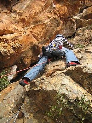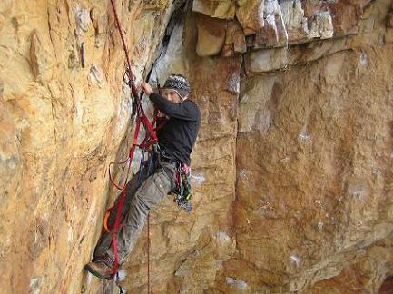 Karl practising his jumaring / aid, while cleaning Orestes: