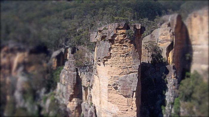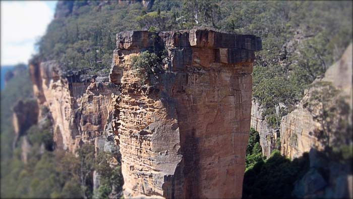 The unclimbed Wolgan Pillar in the Wolgan Valley, Blue Mountains.