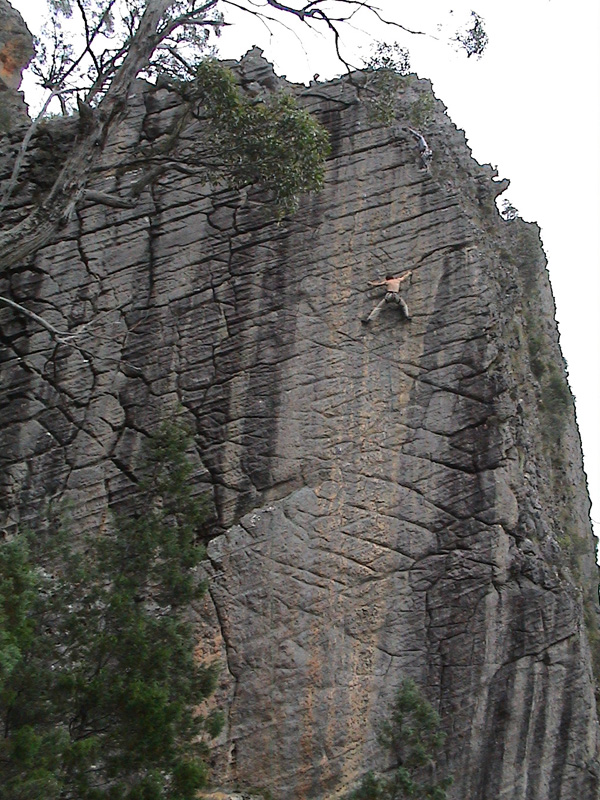 Above Right: Peking Face as seen from the road. The plan was to begin the tour on Peking Face, below Bundaleer. Making the drive down in just under three hours, I followed Neil's instructions to continue past Bundaleer carpark until "the road turns to shit", an apt description for the severely steep and rocky goat trail that it soon became. Leaving the Camry whimping at Neil's site, we saddled up his Subaru 4WD, and cruised the access to Peking Face, passing a spot where Neil claimed to have met, the day before, a sedan and trailer hopelessly wrestling the terrain, with a worried family onboard. Launching up the horrendously steep and loose approach hike at four times the speed of sound, carrying all the gear, Neil soon disappeared from my sight. An event that was to repeat itself with monotonous regularity for the remainder of the trip. As I dragged my breathless carcass up to the base of the cliff, I barely had time to dump what little equipment I carried before hurrying to get in on the route scouting. Neil picked a sharp looking grade 20 line, "Ancient Warrior", for our "warm up" and began racking up for the lead. At this point I realised I'd forgotten to apply sun screen and resigned myself to a round trip back down to the car or suffer the consequences of climbing through 43 degree UV. Panting and straining I returned to the cliff some 20 minutes later to find Neil racked and ready to roll. Sculling water I hunkered in the shade and belayed while Neil commenced battle on "Ancient Warrior". The crux proved to be a pumpy finger crack mid-way up the pitch, where an absence of feet made jamming difficult. Dogging the second I arrived at the anchors feeling worked, but through-ally enjoying the experience. We rapped off a dry old conifer and considered our next route. My turn to lead I requested something far easier.