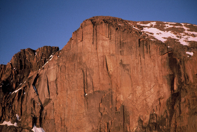 Q: Do you have a climbing hero/heroine? Not really. Its easy enough to be a specialist so I guess I'm more impressed with those people who climb to a high level right across the board from bouldering, sports routes, trad routes and big alpine routes. Lyn Hill was an example of someone who could move seamlessly (no pun intended) from indoor competition to freeing multi-pitch extravaganzas in Yosemite. An impressive woman. Right: Longs Peak, 14,000ft., Colorado Q: So what does your future hold in terms of climbing? What's next on the agenda? I'm not sure. I'd like to go to places that I've not been to before and also to places that I've been to only once or twice before but have really enjoyed. I must admit I'm attracted to the thought of big multi-pitch routes with people I get on well with. There's a route on the South face of the Marmolada (in the Dolomites) called 'Weg durch den Fisch" (The Way through the Fish) which is very long, hard, sparsely protected, and on excellent rock all the way. Trouble is, I'd probably need someone else to drag my sorry arse up it. But it's good to have dreams. Without them, you might as well curl up and die.