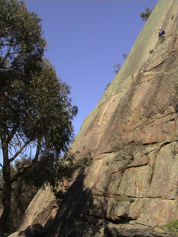 Right: Sparrow Slabs, as viewed from The Saddle. Access is troublesome. The old guide is hopelessly out of date, but will at least get you close. Turn right off the Hume at the 130 km mark (from Melbourne), and duck down "Oak Valley Road" for 2.5 kms. (See: Approach Map). The slabs will appear on your right. Now for the fun. Between you and a rough dirt road (possibly privately owned, and not on the old guide) at the base of the slabs there lies two or three cow paddocks guarded by electric fences and the occasional bull. The old guide mentioned gaining permission to cross these paddocks from some farmer who has presumably long since left the area. The least intrusive approach we could find was to hang a U-Turn and head back up Oak Valley Road 500 metres or so, until you find a small bush paddock near the drive way of a one Milton Gibbs. This paddock is undoubtedly private property (gain permission to cross if you think it wise), but at least it doesn't have any live stock or electric fences, and only a short dart up it will yield the aforementioned rough dirt road. Heading left up this road will bring you to a bush paddock at the base of Sparrow Slabs. Jump the electric fence at the corner (handy boulder), and a short but steep cow trail leads up to the slabs themselves. If you're super keen on bolted slabs, you may well enjoy the "Sparrow Slabs" area, with a considerable number of new routes having gone up. Two vertical lines of bolts a mere metre apart running up some slab to nowhere, is not uncommon. On the other hand, there is at least two or three routes worth a star. The base of the slabs runs for about 200 metres, with the most outstanding feature being a huge splitter crack/chimney near the right side. Just to the right of this we found a line worth doing, though I'm uncertain of it's name. With mixed trad pro and bolts, it's about 25 metres to the double ring bolts, and at a guess would be about grade 14 for pitch one. A second pitch above, following a vegetated finger crack would be hard, but possible. We chose to rap off.