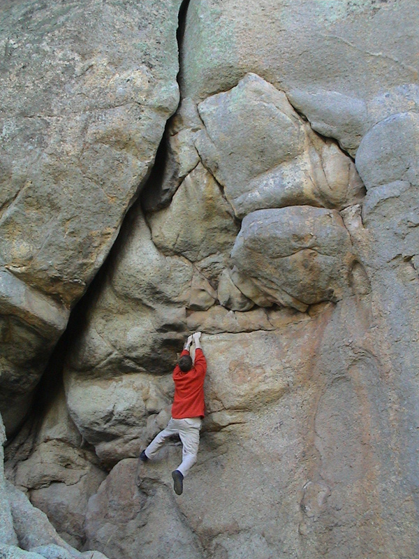 find it. City Living, 26m grade 15 (pictured above), was about the only easily identifiable route. Kent soled the best of it, so we didn't bother with the lead. Right: Kent bouldering "Magic", an incredibly