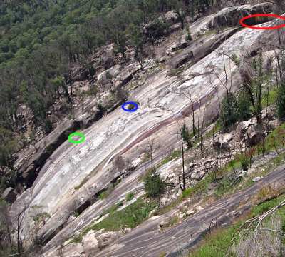 In Will's picture I guess the green circle is the DBB at the end of our P1 and the blue circle is the DBB where we finished P2. The slab directly above that to the solid bushes (with the abandoned abseil sling) at the base of the final corner is our P3. And our P4 ended at the red circle.