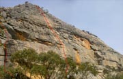 Starts just left of small gumtree on ledge. Boulder off ground then up