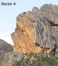Well protected moderate slab climbing with an entertaining finish. The short chimney crack to a dog leg crack three meters left of Pike. Take the ramp up right to the base of the shallow orange corner at the apex of the wall which is passed on the right. FFA David Jupp, Tim Marsh 3.11.02