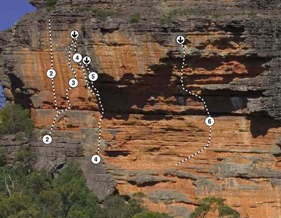 small wall. Scramble down short face and then down scrub gully to bottom.