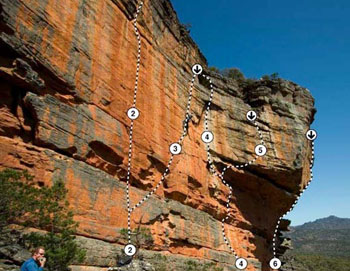 impressive red face, where a good wire protects the moves to the ledge. Move 4m R on ledge, then climb the face 3m L of the thin