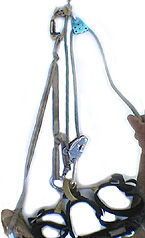 As you near the top of the jug the rope runs through the GriGri of it's own accord, which is not a bad thing as it makes the jug easier the higher you go. When you sit back into your GriGri it will still lock off as normal. Mind you, as you get higher the jumar gets harder to push up the rope as you are also lifting the weight of the rope through the pulley. One has to hang on to the tail of the rope coming out of the pulley and if you are pulling on this tail you achieve an effective 3 to 1 haul system, brilliant. You'll note that I have the SRT ascender tied in to me directly as a back up and the foot loop is made up to suit me. Therefore people really do need to fiddle around with lengths which best suit them. I am unwilling to advise of lengths for these items. You'll also notice that with the GriGri in combination with the jumar backup there are two points of contact with the rope. The SRT ascender jumars also have the lockable cam on the rope and the biner through the hole in the jumar also provides a backup so that there is absolutely no way that the jumar can come off the rope even in the most severe traversing situations. When jug cleaning aid pitches as a second it might be a bit fiddly but there are ways around having to unclip the jumar, for instance clip a long draw on to the piece to be cleaned, pull yourself into the piece and unclip the biner attached to the piece from the rope, lower yourself off until weight is off the piece and proceed to clean the piece. Of course on steeply overhanging sections other tricks come into play but that's a whole nuther story.